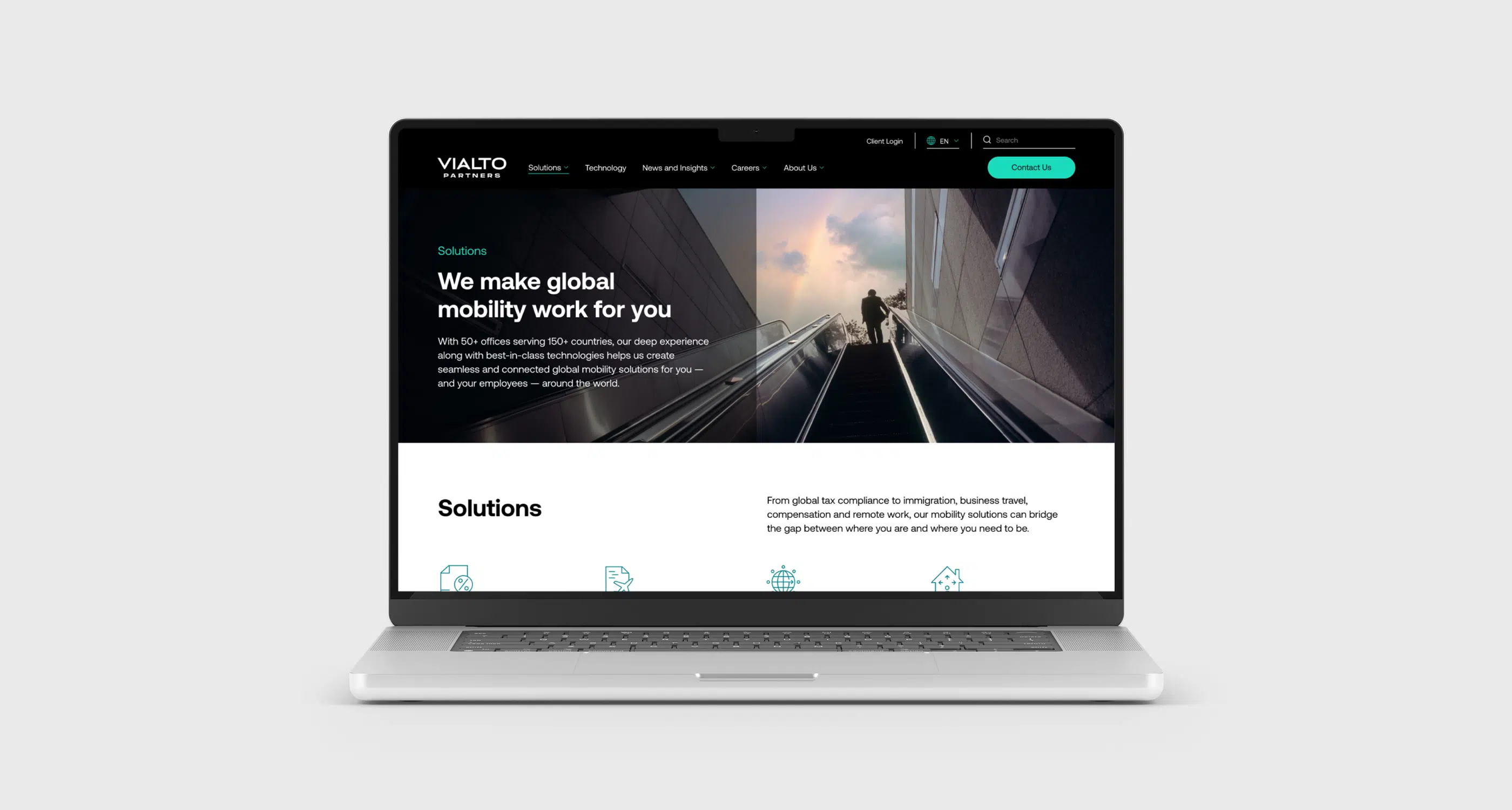 The MVP site comprehensively positioned Vialto Partners as trusted experts—critical for a Private Equity-led spin-out aiming to reassure clients and accelerate market credibility. That effort began with the name. The NewCo brand name needed to be forward-looking and communicate the company’s ambition while honoring the legacy and expertise that shaped it. The crossbar of the “A” in Vialto evokes a bridge, depicting a sense of connection and upward momentum, while the bespoke and extended typeface conveys a sense of gravitas, trust, and expertise—striking the right balance between innovation and stability.