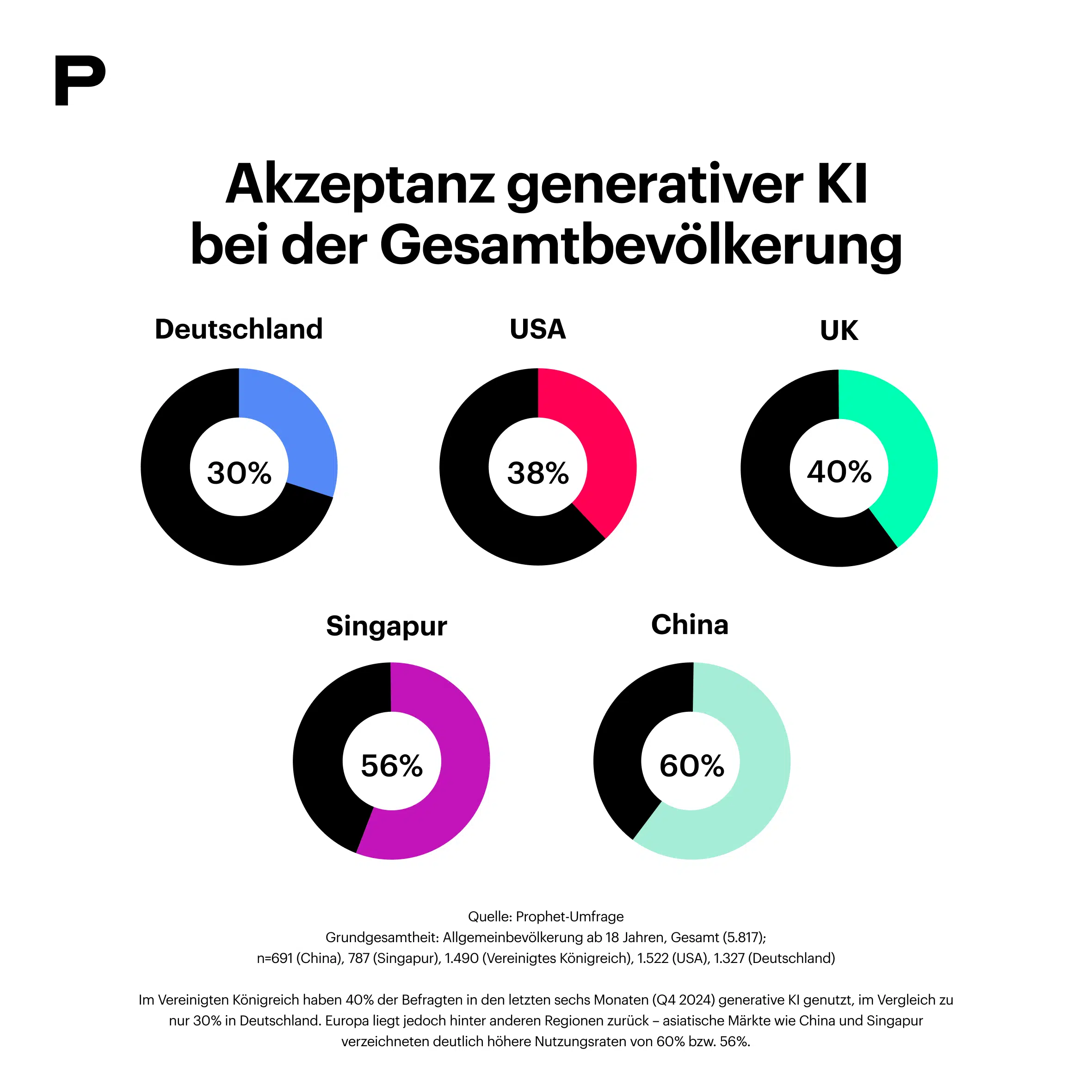 Layla Keramat, Partnerin bei Prophet in Deutschland, erkennt deutliche Trends bei der Einführung von KI in Europa. Sie basieren auf Daten aus dem aktuellen Prophet Forschungsbericht „The Rise of the AI-Powered Consumer“, welche zeigen, dass rund ein Drittel der deutschen (30 %) und fast 40 % der britischen Verbraucherinnen und Verbraucher in den letzten sechs Monaten GenAI-Tools genutzt haben. Allerdings hinkt Europa anderen Regionen hinterher – asiatische Märkte wie China und Singapur verzeichnen mit 60 % bzw. 56 % deutlich höhere Akzeptanzraten. Diese Zurückhaltung in Europa ist auf wachsende Skepsis und Datenschutzbedenken zurückzuführen.