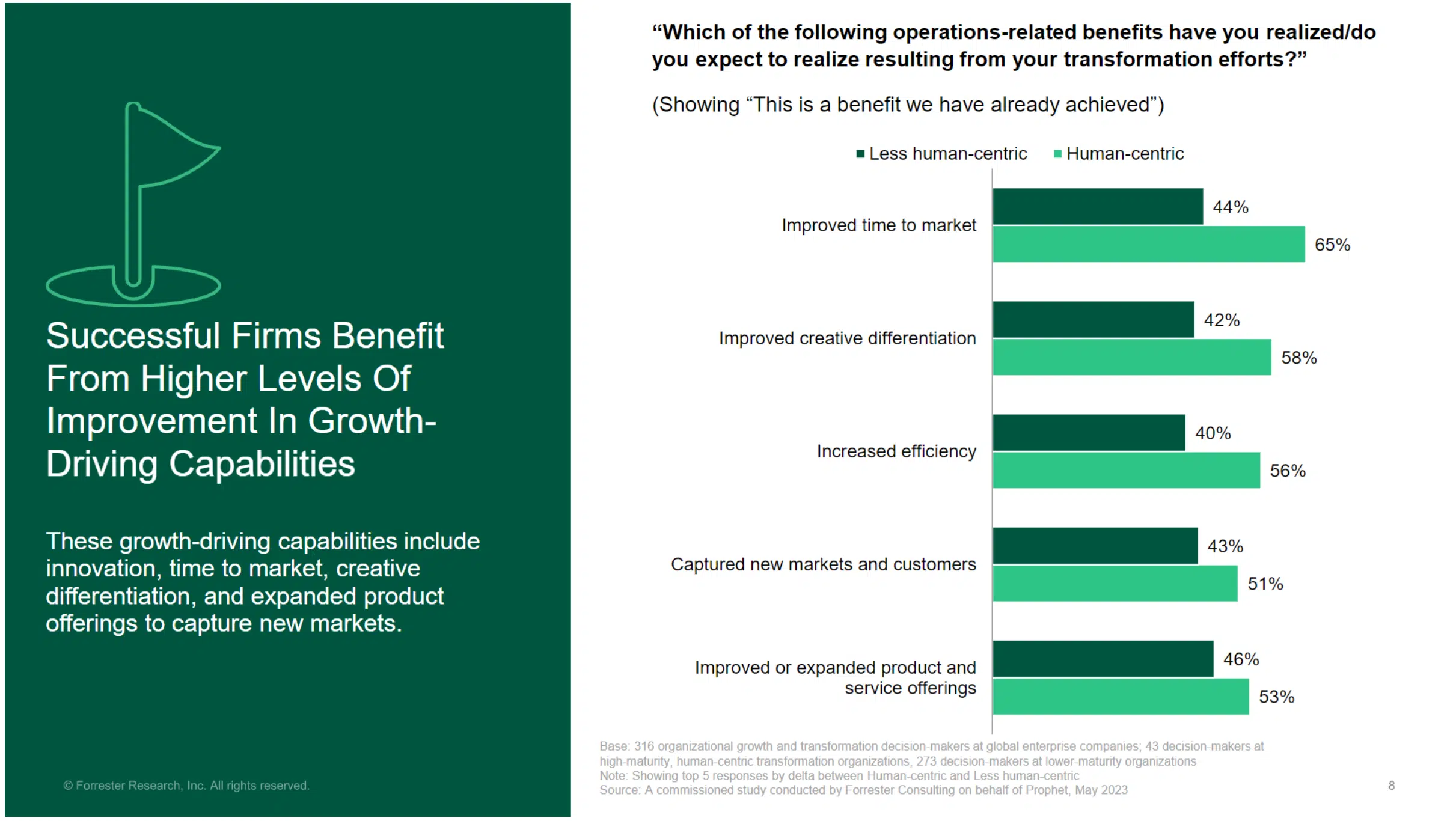 The impact is clear. In May 2023, Prophet commissioned Forrester to explore how firms use human-centricity to design their transformation initiatives and assess their performance. This joint research confirmed that firms that adopt a human-centric focus were: