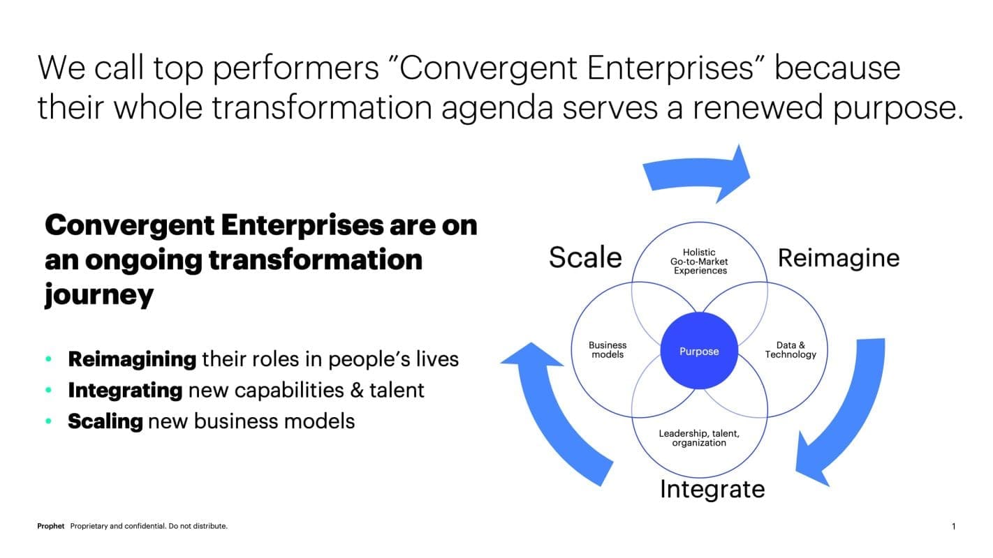 Prophet is a convergence accelerator and purpose-led transformation consultancy that will help you reimagine your firm, integrate and scale digital investments, and drive real, defensible growth. We believe that to accelerate convergence we take your existing assets – such as data, brand, culture, business models – reimagine them for today’s customers and employees and look for new ways to integrate capabilities and talent with a reimagined sense of purpose. Then, we drive towards scale.