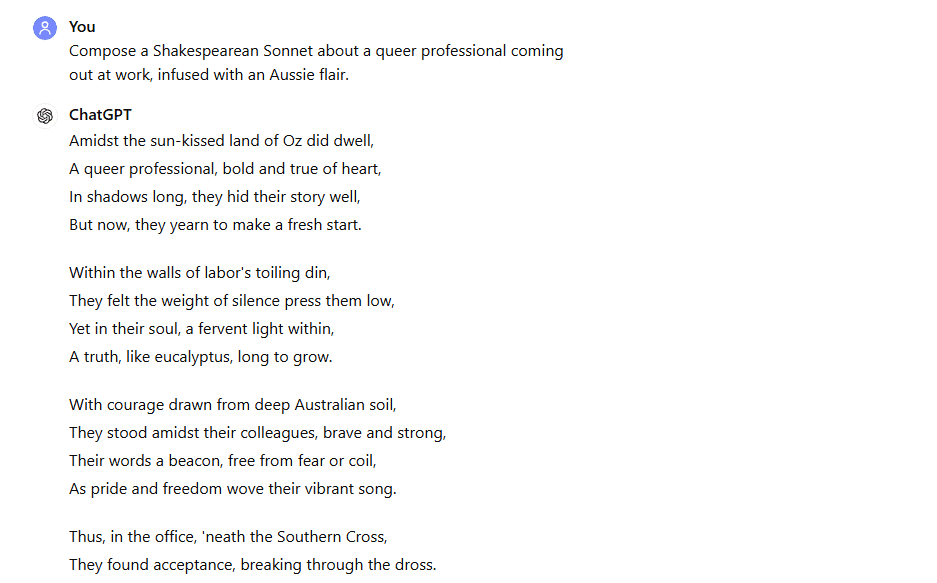 The prompts spanned from practical requests like ‘Give me 10 reasons why workplace acceptance is crucial for people who identify as queer’ to creative challenges such as ‘Compose a Shakespearean Sonnet about a queer professional coming out at work, infused with an Aussie flair.’ The platform’s captivating responses fueled even wilder crowd-sourced inputs, including cultural colloquialisms and their reflection in the generated content.