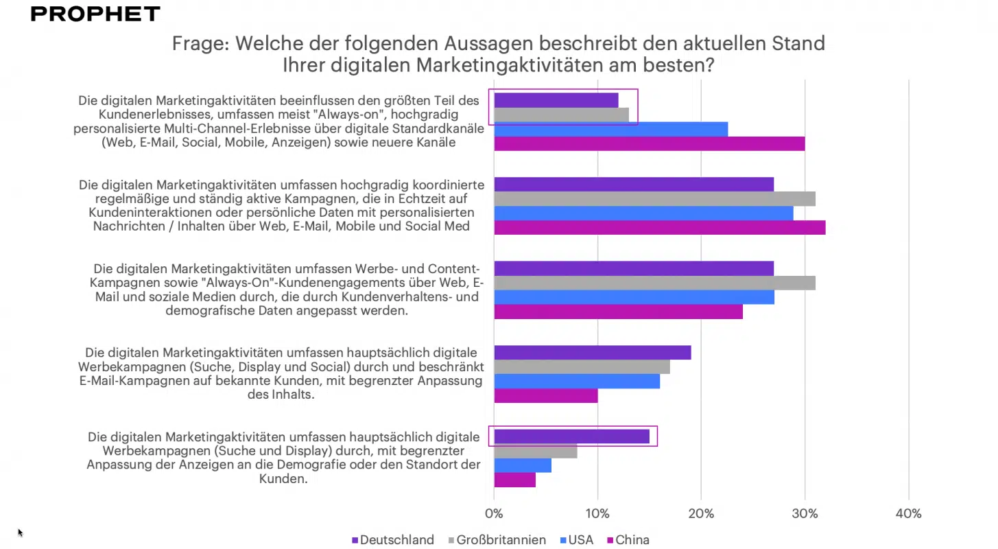In Deutschland wird beim Thema Digital Marketing immer noch hauptsächlich an Werbekampagnen gedacht. Was die Schaffung einer Customer Experience angeht, liegt das digitale Marketing dagegen in beiden Ländern unter dem Durchschnitt. Auch die Prioritäten, die für die Zukunft gesetzt werden, unterscheiden sich. Im Rahmen der digitalen Transformation legen britische Firmen weniger Wert auf die Einstellung und Schulung von Mitarbeitern, während in Deutschland Änderungen des Geschäftsmodells weniger wahrscheinlich erscheinen. Cybersicherheit und die Inanspruchnahme von Clouds haben in Großbritannien hohe Priorität, während in Deutschland funktionsübergreifende Kooperationsplattformen weniger bedeutend sind.
