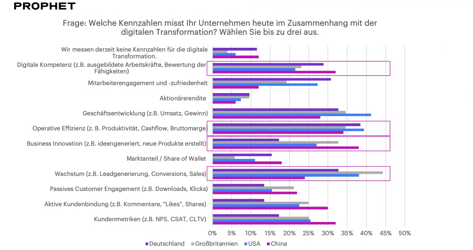 Wenn man die Daten von Altimeter genauer anschaut und einen Blick auf die Unterstützung digitaler Transformationsinitiativen durch die erste Führungsebene wirft, so wird in Großbritannien tendenziell eher ein CDO oder CIO und in Deutschland oder den USA eher dem CIO oder CEO zufällt. Außerdem vermelden mehr amerikanische und chinesische Firmen hervorragende Ergebnisse ihrer Transformationsprogramme, während eine etwas größere Zahl europäischer Unternehmen lediglich gute oder mittelprächtige Resultate berichtet.
