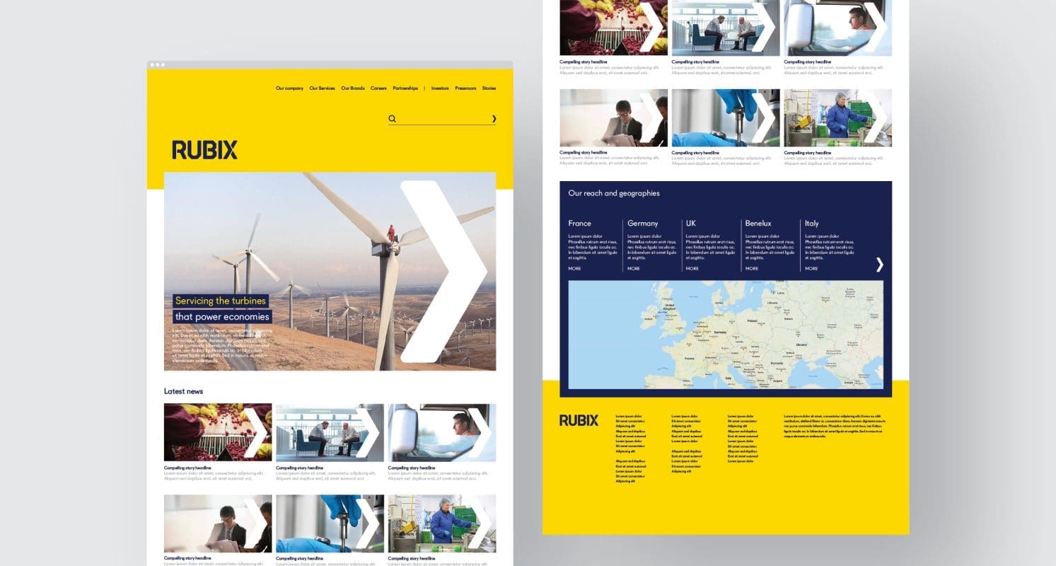 Im Anschluss wurde eine einmalige Markenidentität geschaffen, um Rubix vom Wettbewerb zu differenzieren. In einer Branche, die überwiegend faktenbasiert agiert, wurde ganz gezielt umfassendes visuelles sowie inhaltliches Storytelling eingesetzt, um die Marke von der Masse abzuheben. Hierfür wurden drei Kernelemente der Marke definiert: ein verbal approach, welcher aufzeigt, wie Rubix seinen Kunden hilft; eine brand colour, die Rubix‘ Präsenz und Reichweite repräsentiert; und ein visual device, welches die verschiedenen Ansätze zur Unterstützung der Kunden verdeutlicht.