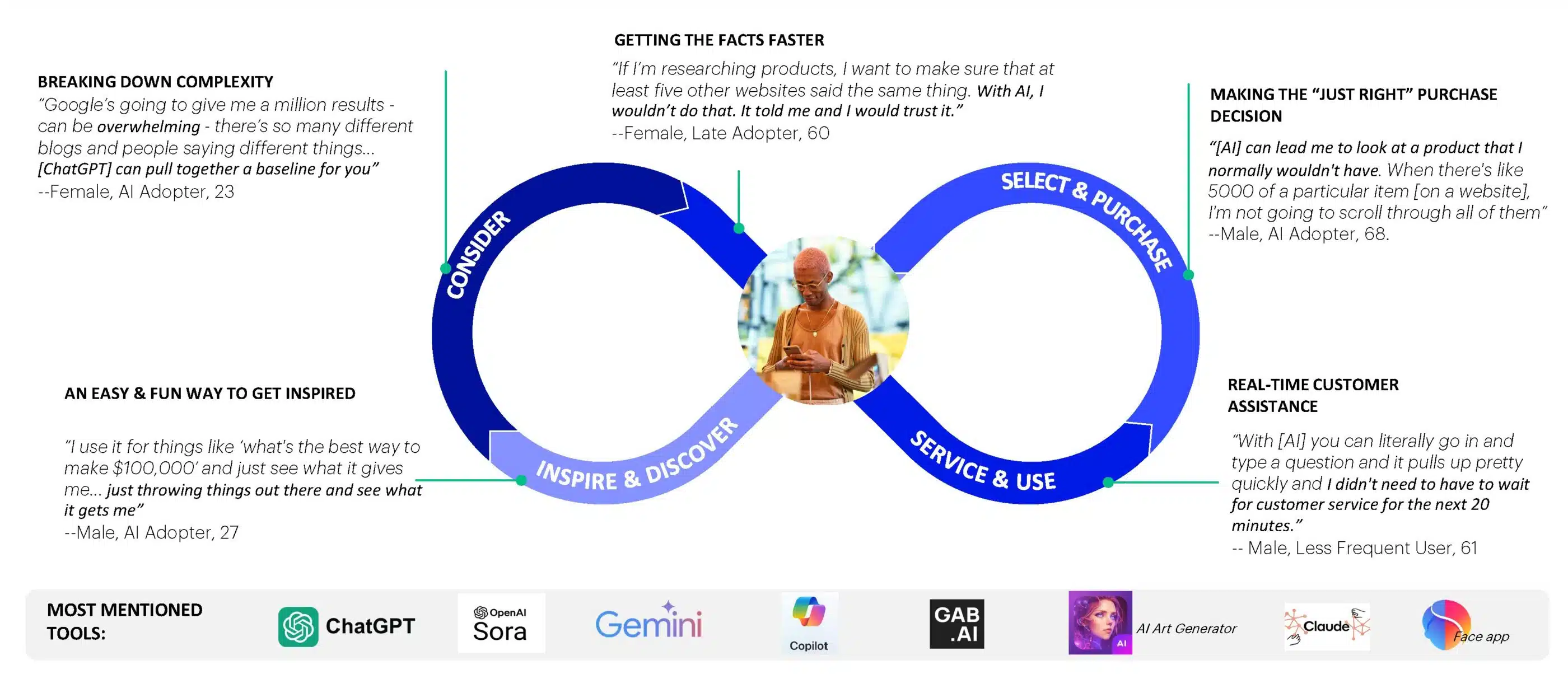 While the quantitative research is still underway, we wanted to share initial findings from our qualitative sessions because we think the implications are potentially profound. Specifically, we see clear evidence of the rise of AI-powered consumers who are moving faster, doing more and expecting more in terms of fast, frictionless and individualized offerings. They seem increasingly ready to turn over more of their lives to AI, are watching brands’ commitments to ethical AI, and are deeply invested in finding even more ways to benefit from it.